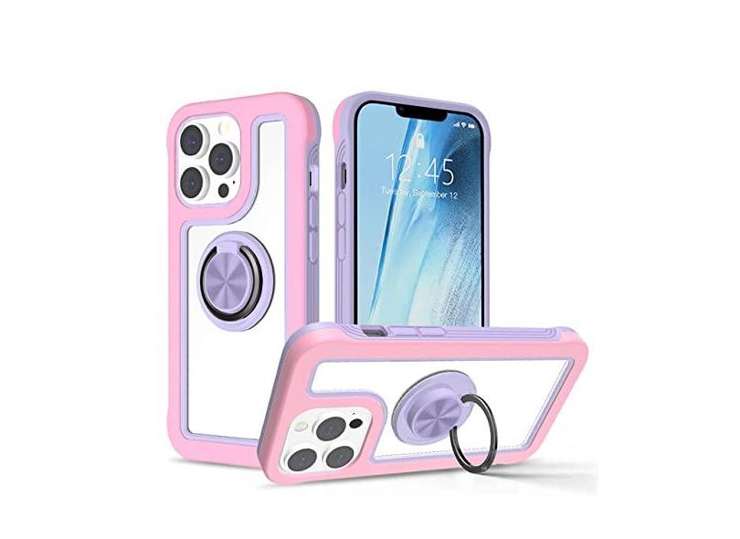 360 Capa protetora de telefone de camada dupla de corpo inteiro para iPhone 13 12 11 14 Pro Max XS 7 8 Plus Capa transparente com suporte para anel de dedo, rosa roxo, para iphone 13ProMax