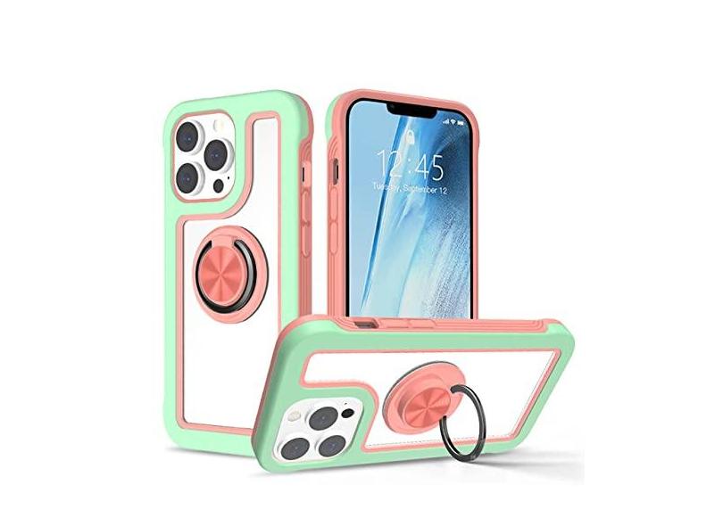 360 Capa protetora de telefone de camada dupla de corpo inteiro para iPhone 13 12 11 14 Pro Max XS 7 8 Plus Capa transparente com suporte para anel de dedo, verde rosa, para iPhone 14pro