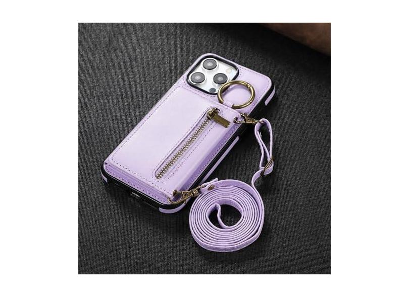 Alça de ombro com zíper carteira de couro capa porta cartão para iPhone 11 12 13 14 15 Pro Max Plus cordão telefone bolsa capa anel, roxo, para iPhone 14 Pro