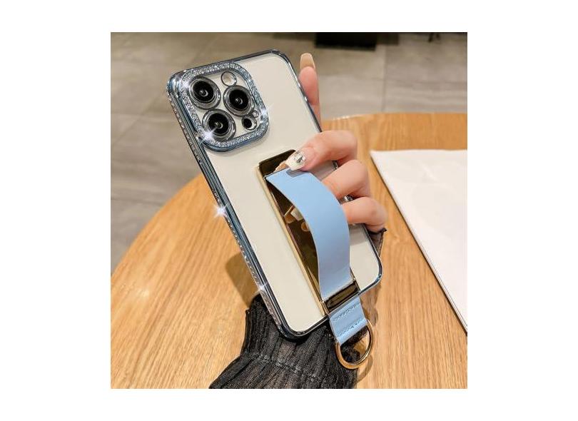 Alça de pulso anel de dedo suporte invisível capa de telefone para iPhone 14 15 ProMax 12 13 Pro Max 11 Plus capa luxuosa revestida de diamante, azul celeste, para iPhone 12Pro