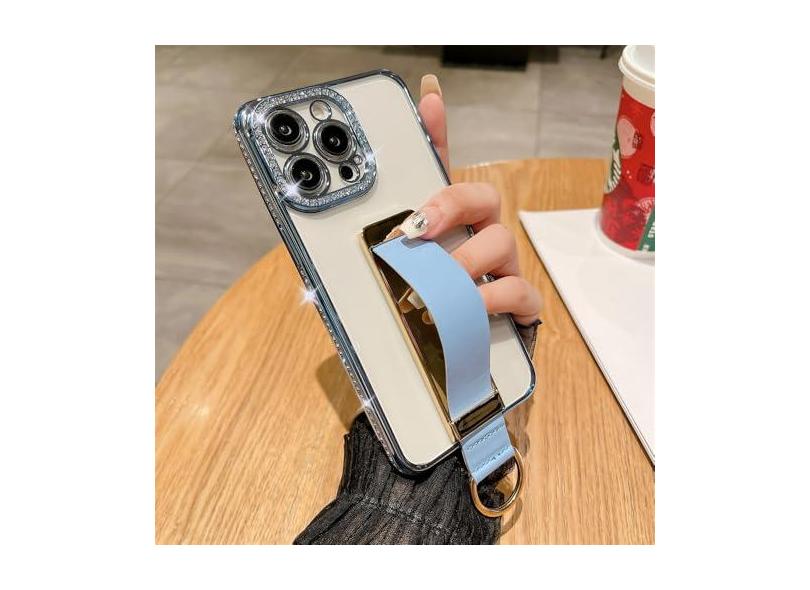 Alça de pulso anel de dedo suporte invisível capa de telefone para iPhone 14 15 ProMax 12 13 Pro Max 11 Plus capa luxuosa revestida de diamante, azul celeste, para iphone 14PLUS