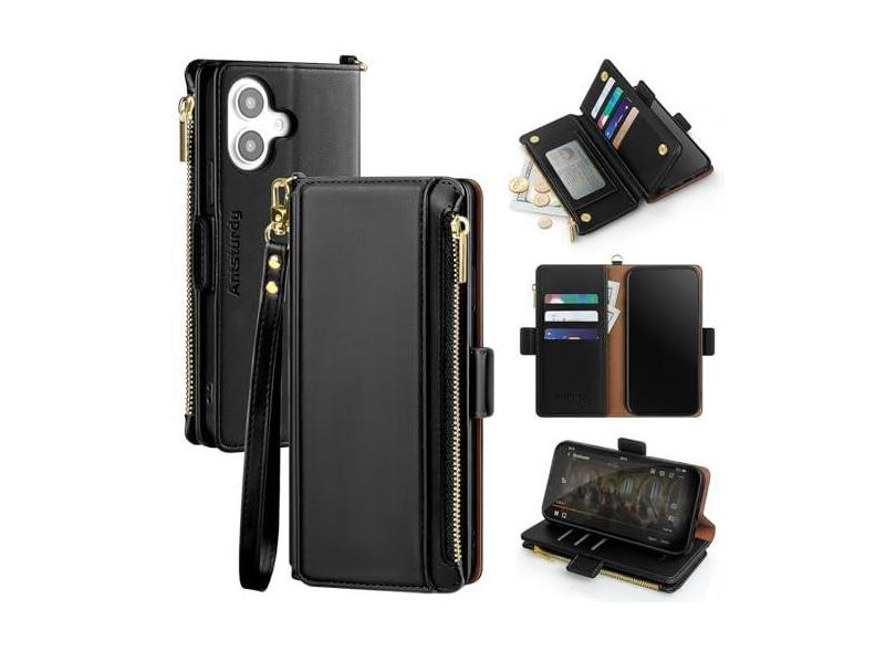 Antsturdy Capa carteira compatível com iPhone 16 de 6,1 polegadas, capa de telefone de couro PU com bloqueio de RFID, capa flip com suporte, alça de pulso com zíper, compartimentos para cartão de