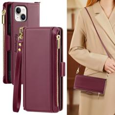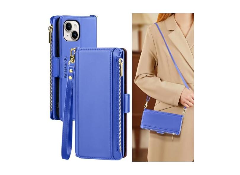 Antsturdy Capa carteira para iPhone 14 Plus feminina masculina 【bloqueio RFID】 Capa tiracolo de couro PU para Apple iPhone 14 Plus com zíper com alça de pulso flip capa fólio suporte para cartão de