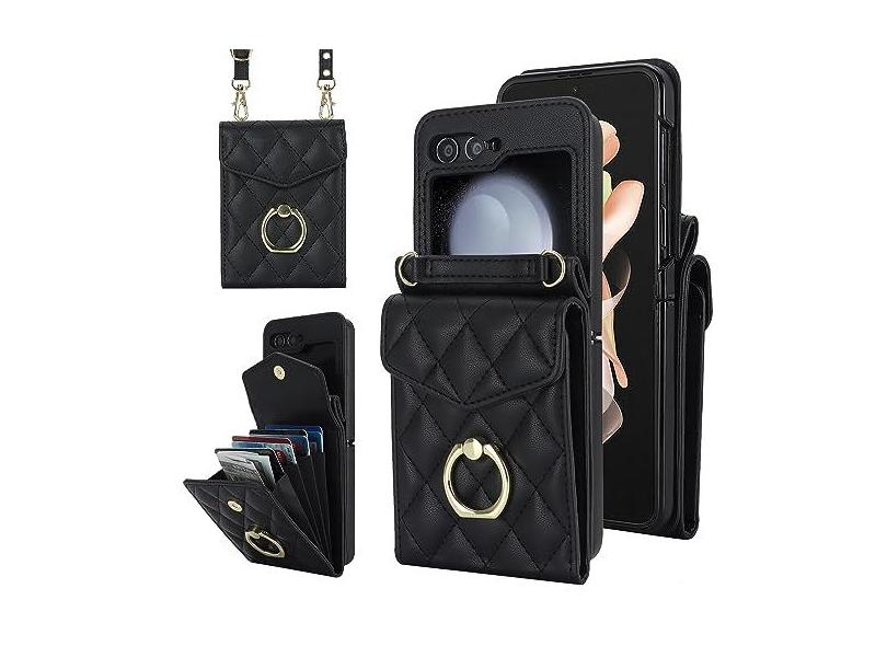Asuwish Capa de celular para Samsung Galaxy Z Flip 5 5G 2023 com anel de bloqueio de RFID, alça transversal para pulso, suporte para cartão de crédito, acessórios para celular ZFlip5 Z5 G Flip5 5Z