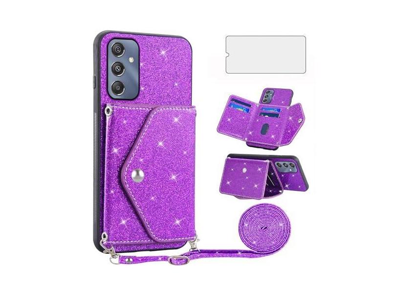 Asuwish Capa de telefone para Samsung Galaxy A25 5G/A24 4G/M34/F34 Capa carteira com protetor de tela de vidro temperado e alça transversal cordão Bling Glitter suporte para cartão de crédito A 25 25A