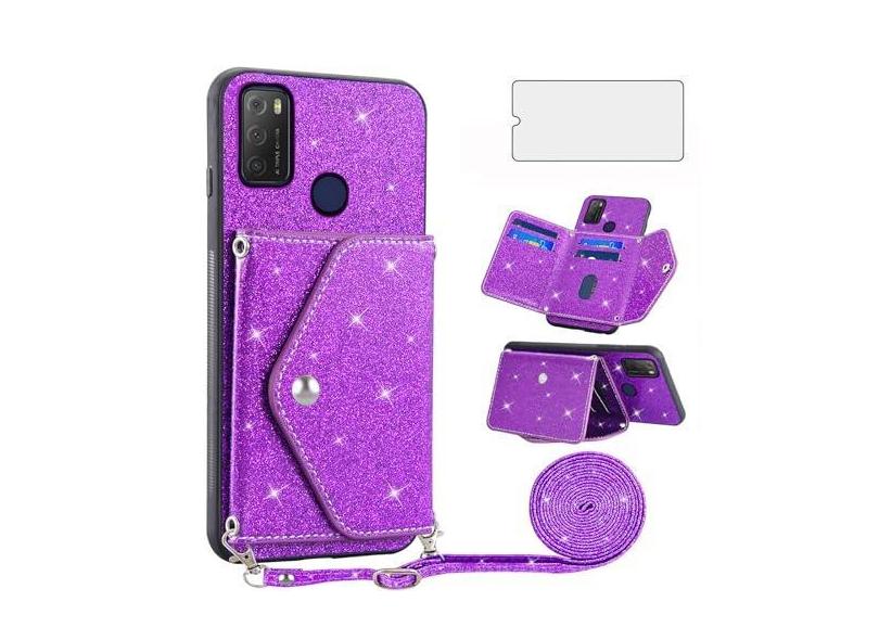 Asuwish Capa de telefone para TCL 20E 20Y TLC 6125F capa carteira com protetor de tela de vidro temperado e alça transversal cordão Bling Glitter suporte para cartão de crédito celular Alcatel 1S