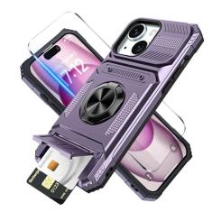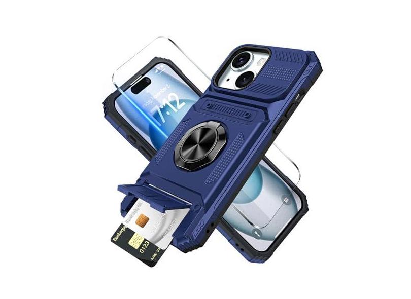 Benbenjaytek Capa carteira para iPhone 15 com suporte para cartão + 1 protetor de tela, (2 cartões) e suporte de anel de 360°, capa resistente à prova de choque de grau militar para iPhone 15 de 6,1