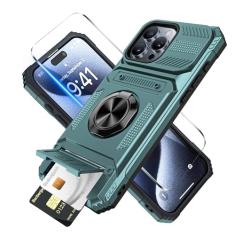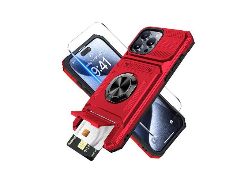 Benbenjaytek Capa carteira para iPhone 15 Pro com suporte para cartão + 1 protetor de tela, (2 cartões) e suporte de anel de 360°, capa resistente à prova de choque de grau militar para iPhone 15 Pro