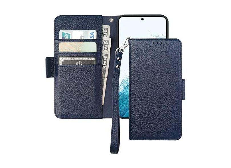 Bocasal Capa carteira para Galaxy S22 5G, suporte de couro legítimo, carregamento sem fio, bloqueio de RFID, compartimento para cartões, capa dobrável com suporte para livro com alça de pulso de 6,1