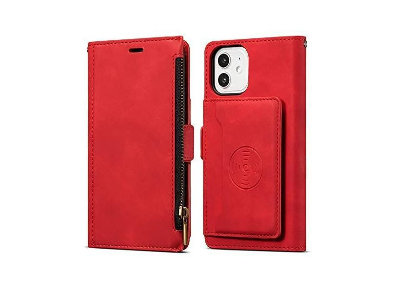 Capa carteira de couro para iPhone 11 12 13 14 Pro Mini XR XS Max X 8 7 6s 6 Plus SE 2020 2022 SE3 Capa de livro com zíper, vermelha, para iPhone 13 Mini