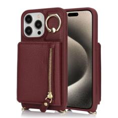 Capa carteira de couro para telefone para iPhone 15 14 13 12 11 Pro Max XS X XR Capa protetora de couro com anel porta-cartões com zíper, vinho tinto, para iPhone 11ProMax