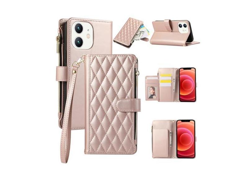 Capa carteira para iPhone 11, capa de couro para celular com 6 compartimentos para cartão e 1 compartimento para dinheiro e 1 bolsa com zíper, fivela magnética à prova de choque com corda de mão e