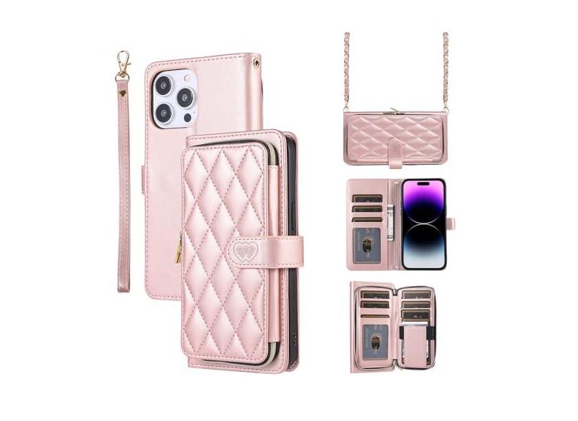 Capa carteira para iPhone 15 Pro, bolsa flip de couro com zíper com suporte para cartão, capa de telefone à prova de choque com fivela magnética com corda de mão e corrente de couro para mulheres