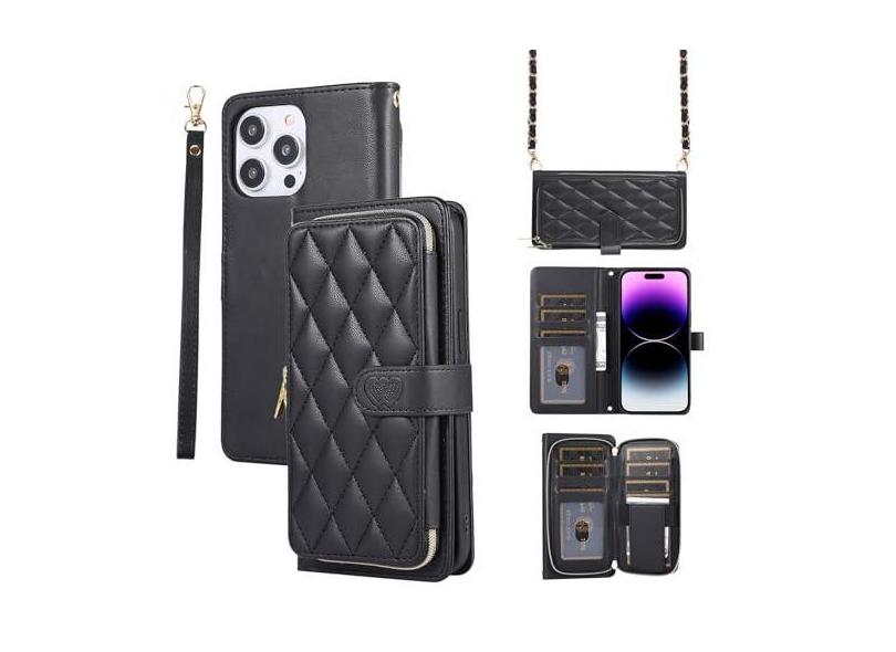 Capa carteira para iPhone 15 Pro Max, bolsa de couro dobrável com zíper com suporte para cartão, capa de telefone à prova de choque com fivela magnética com corda de mão e corrente de couro para
