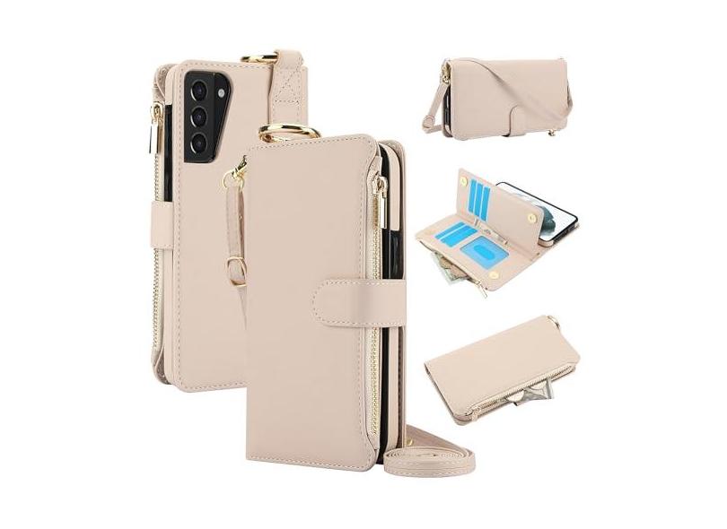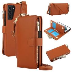 Capa carteira para Samsung Galaxy S21, [bloqueio de RFID] [bolso com zíper] [porta-cartão] capa protetora flip de couro PU com corda transversal, pulso/anel, capa de telefone masculina e feminina