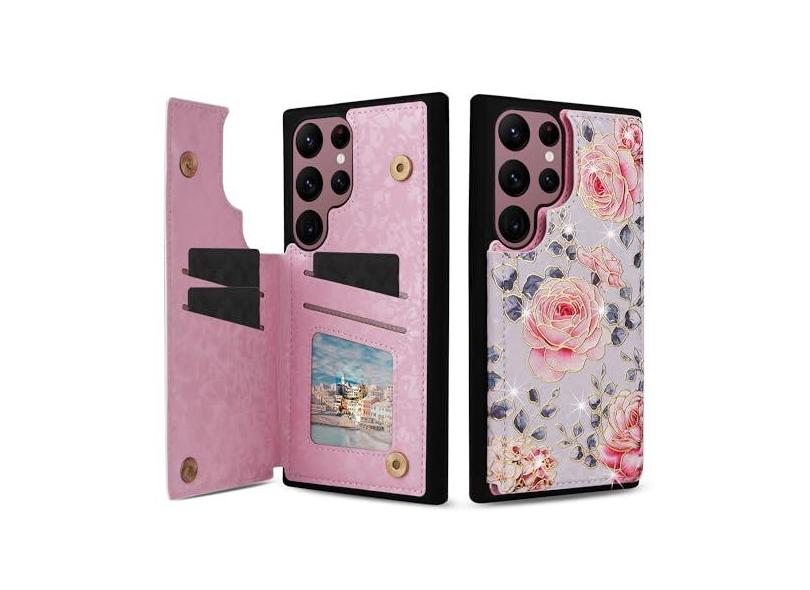 Capa carteira para Samsung Galaxy S22 Ultra com suporte para cartão, capa de couro com bloqueio RFID para mulheres e meninas, capa de telefone à prova de choque com suporte para Samsung S22 Ultra 5G