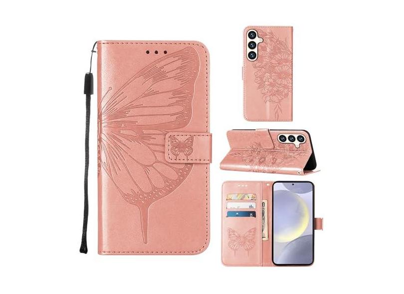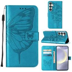 Capa carteira para Samsung Galaxy S24 Plus, capa protetora feminina de couro PU com alça de pulso, compartimentos para cartões, bolsa em relevo borboleta com suporte de flor, capa flip para Samsung