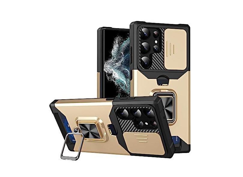 Capa compatível com Samsung Galaxy S24 Ultra TPU com protetor de câmera | Suporte de anel giratório de 360° | Capa de lente deslizante resistente a impactos | Capa protetora com suporte para cartão