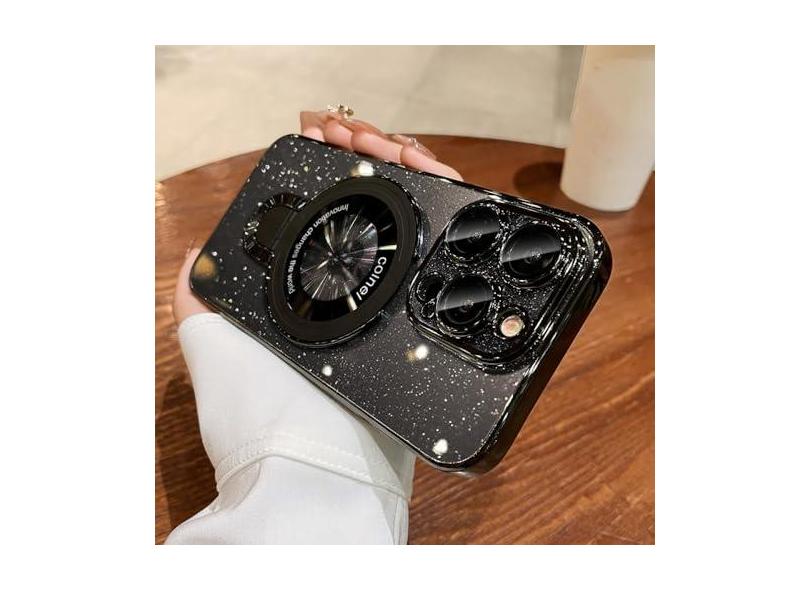 Capa de carregamento sem fio luxuosa para iPhone 11 12 13 14 15 Pro Max Plus Glitter suporte de anel magnético capa transparente, preta, para iPhone 15Pro Max