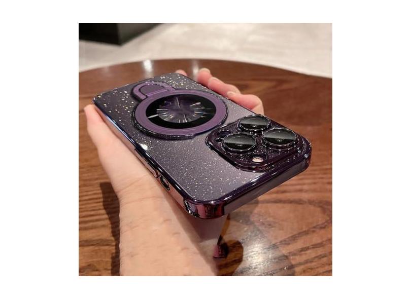 Capa de carregamento sem fio luxuosa para iPhone 11 12 13 14 15 Pro Max Plus Glitter suporte de anel magnético capa transparente, roxa, para iPhone 12Pro Max