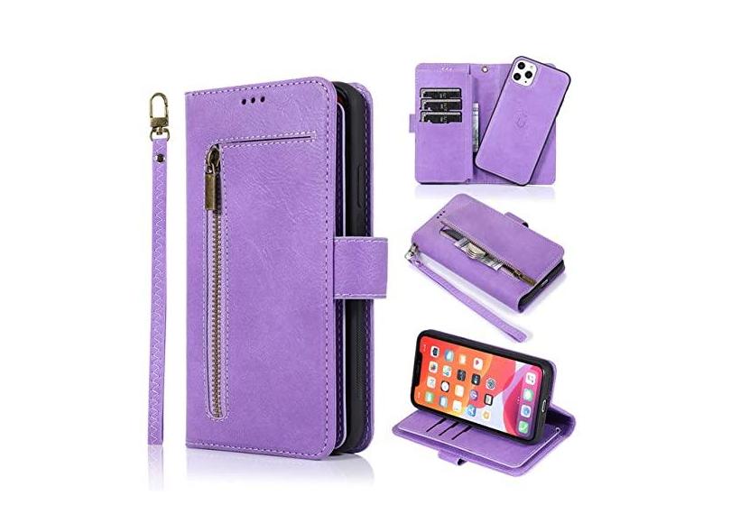 Capa de couro de luxo para iPhone 14 13 12 11 Pro XS Max XR X SE 2022 8 7 6 6S Plus Carteira com zíper Capa removível, roxa, para iPhone 12