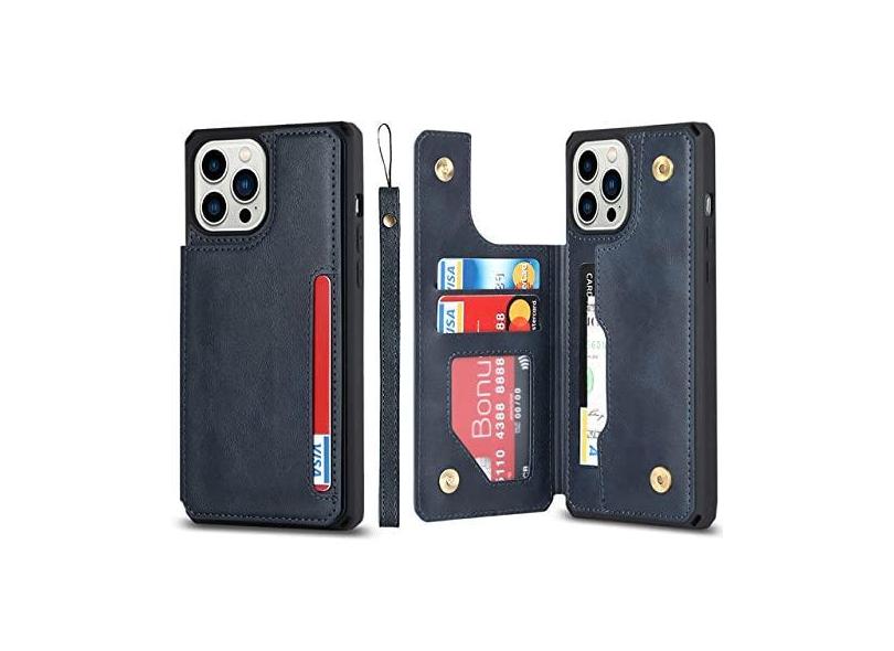 Capa de couro flip para iPhone 12 13 Mini 14 11 Pro Max Carteira Capa para telefone com compartimento para cartão de crédito Alça de suporte, azul, para iPhone 13 Mini