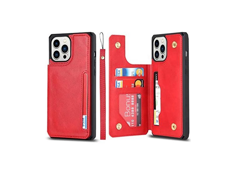 Capa de couro flip para iPhone 12 13 Mini 14 11 Pro Max Carteira Capa para telefone com compartimento para cartão de crédito Alça de suporte, vermelha, para iPhone 12 Mini