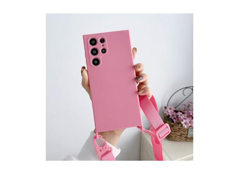 Capa de silicone líquido com alça de colar crossbody para Samsung S23 S22 Ultra S21 Plus S20FE A52 A72 A22 A32 Candy Color Cover, rosa, para S21 FE