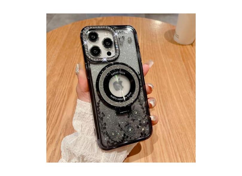 Capa de suporte luxuosa flor glitter diamante para iPhone 14 11 12 15 13 Pro Max 14 15Plus capa à prova de choque, preta, para iPhone 13 ProMax