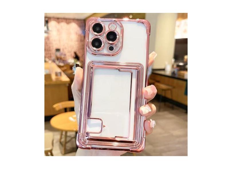 Capa de suporte para bolsa de cartão transparente anti-queda galvanizada para iPhone 15 Pro Max 14 Plus 13 12 11 Capa carteira macia à prova de choque, rosa, para iPhone 13