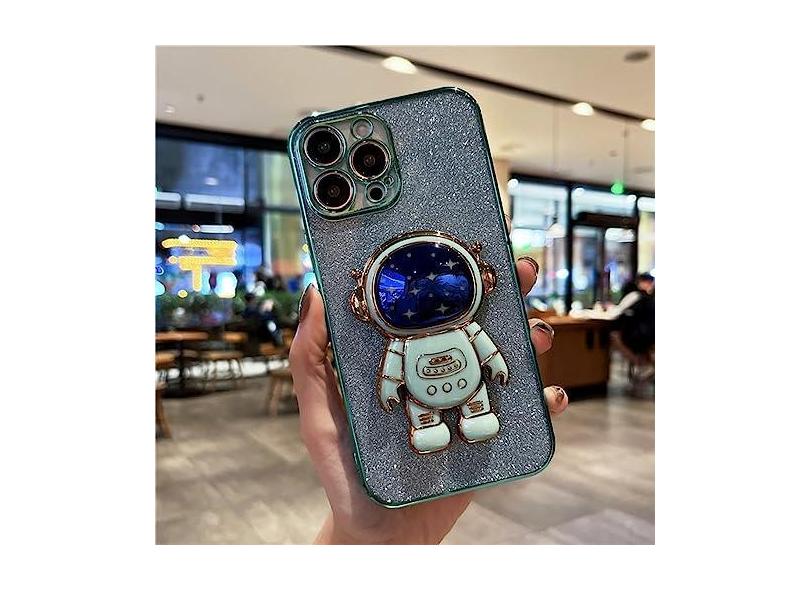 Capa de telefone com suporte de astronauta com brilho e chapeamento para iPhone 11 12 13 Mini 14 15 Pro Max X XR XS Capa de suporte em 7 8 Plus, verde claro, para iphone 13
