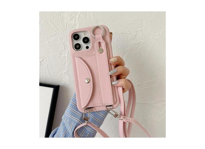Capa de telefone crossbody com alça de pulso para iPhone 13 12 Mini 15 14 11 Pro XS Max XR 7 8 Plus Suporte para cartão Carteira com cordão capa de couro, rosa, para iPhone 15