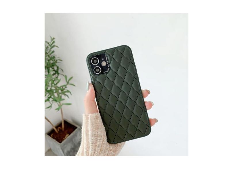 Capa de telefone de couro duro com treliça de proteção de pára-choques de luxo para iPhone 13 12 Pro Max 7 8 Plus X XS XR 11 SE 2022 Capa de lente de metal, verde exército, para iPhone 12Pro