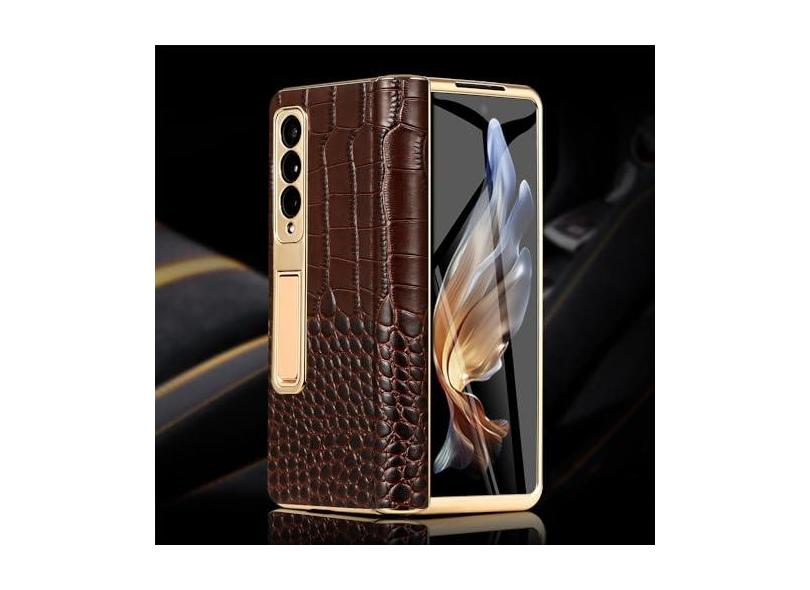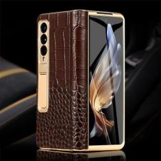 Capa de telefone de couro para Samsung Galaxy Z Fold 5 4 3 Fold4 Fold5 banhado a ouro dobradiça magnética suporte capa traseira com filme espelhado, grão de crocodilo, para Galaxy Z Fold 4
