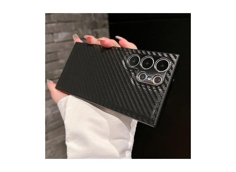 O menor preço encontrado no Brasil para Capa de telefone luxuosa de couro de fibra de carbono com contraste para Samsung S23 S24 Ultra S21 S22 Plus A54 A34 A14 5G Capa protetora de lente de metal, preta, para Samsung S24 atualmente é R$ 122,70.