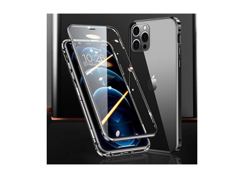 Capa de telefone magnética de metal com proteção total 360 ° para iPhone 15 14 13 12 11 Pro Max X XS XR 8 7 Plus Capa de vidro dupla face, preta, para IPhone14Pro