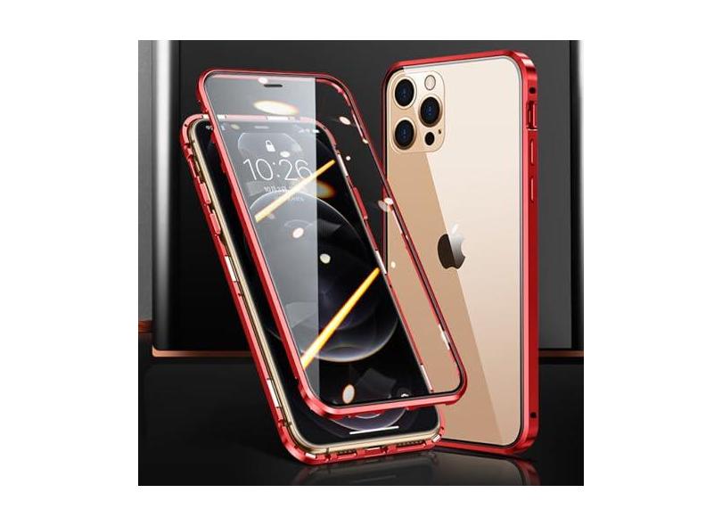 Capa de telefone magnética de metal com proteção total 360 ° para iPhone 15 14 13 12 11 Pro Max X XS XR 8 7 Plus Capa de vidro dupla face, vermelha, para IPhone12