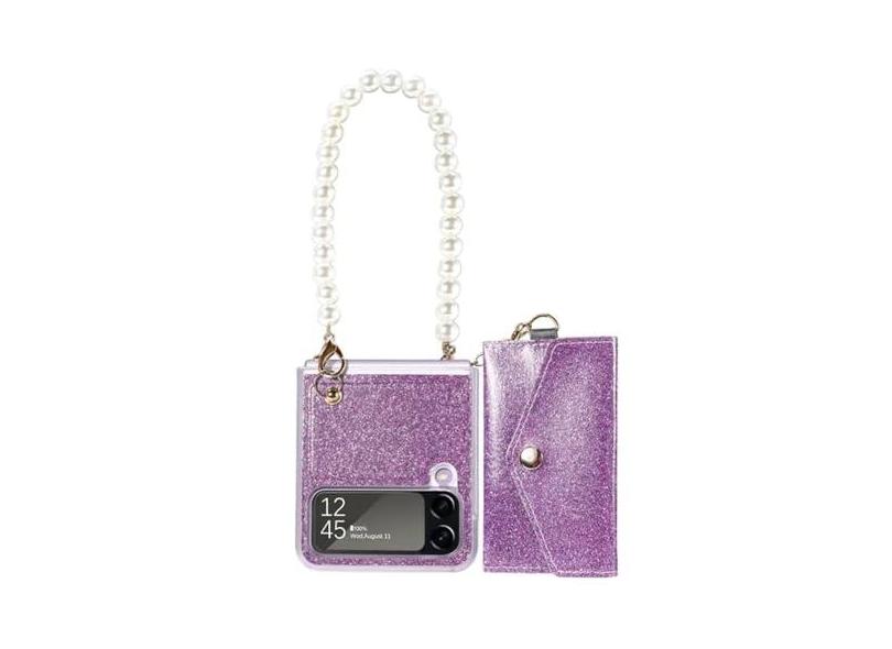 Capa de telefone para cartões de corrente com pulseira de pérola brilhante para Samsung Galaxy Z Flip 4 5G Flip3 Zflip3 Capa de carteira envelope com bolsa de moedas, roxa, para Galaxy Z Fli