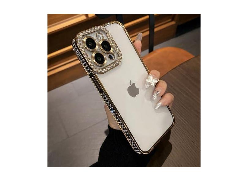 Capa de telefone transparente com revestimento de luxo com glitter diamante strass para iPhone 15 11 12 13 14 Pro Max Capa de silicone macio, dourada, para iPhone 15 Pro