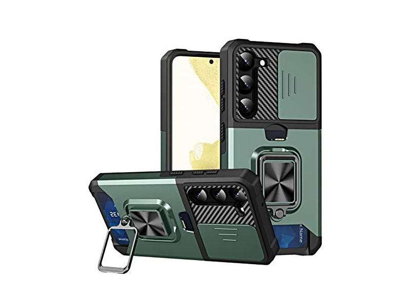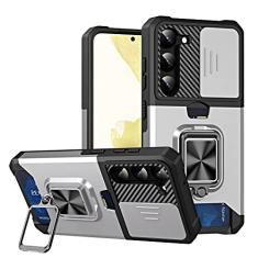 Capa de TPU compatível com Samsung Galaxy S24 com protetor de câmera | Suporte de anel giratório de 360° | Capa de lente deslizante resistente a impactos | Capa protetora com suporte para cartão
