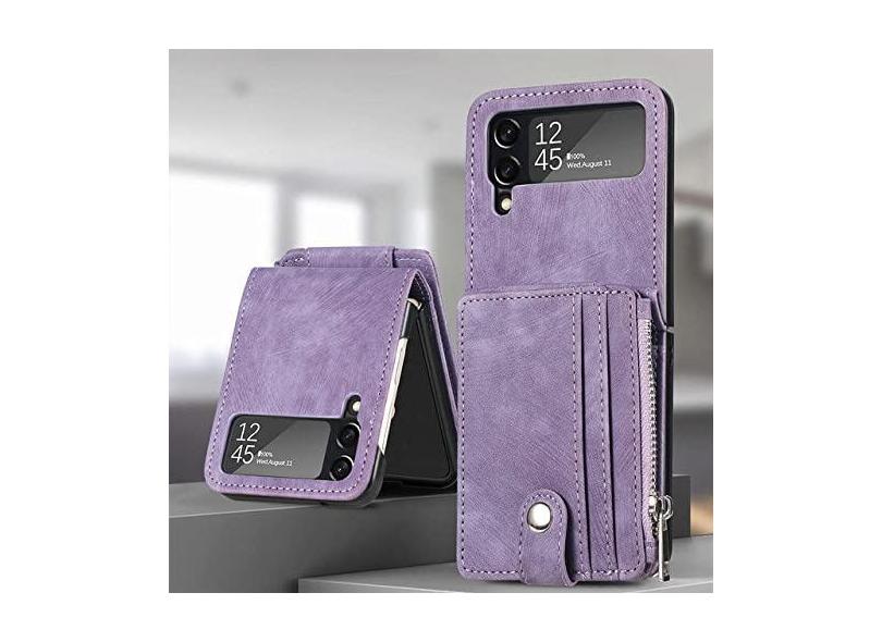 Capa dobrável tipo carteira de couro retrô destacável com zíper para Samsung Galaxy Z Flip 4 5G Flip4 Flip3 2 em 1 capa de telefone com suporte para cartões, roxa, para Samsung Z Flip 4