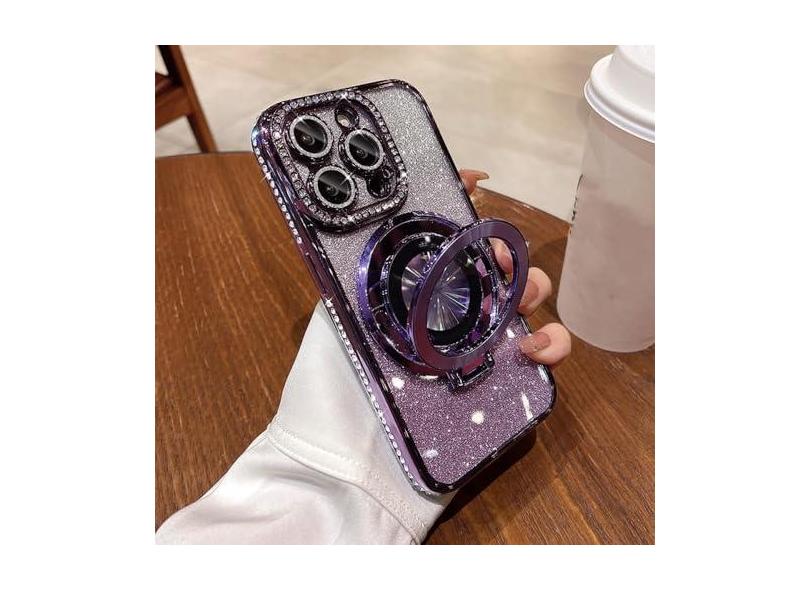 Capa luxuosa de joias com carregamento sem fio para iPhone 11 12 13 14 15 Pro Max Plus Glitter com suporte de anel magnético capa protetora, roxa, para iphone 15Plus