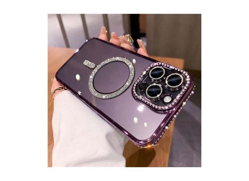Capa macia de silicone de carregamento magnético com brilho de diamante de luxo para iPhone 14 13 12 Pro Max Plus 11 Capa transparente à prova de choque, roxa, para iPhone 12ProMax