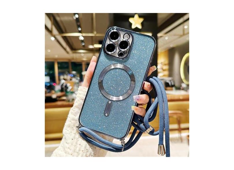 Capa magnética com cordão crossbody brilhante para iPhone 15 14 Plus 13 12 11 Pro Max Capa traseira de TPU macio galvanizado, azul Sierra, para iPhone 11Pro Max