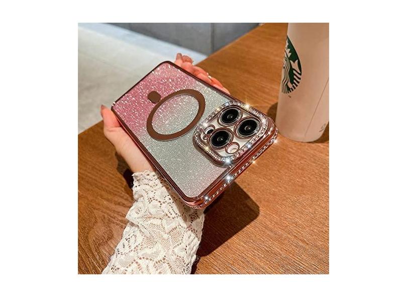 Capa magnética Gradient Glitter Diamond para iPhone 11 13 12 14 Pro Max 14 Plus Capa de carregamento sem fio transparente macia, rosa, para iPhone 14 Pro