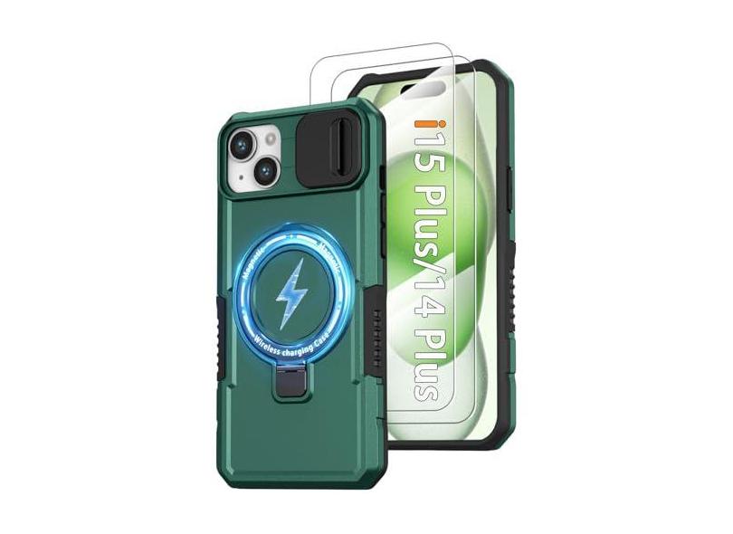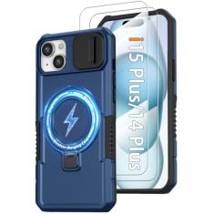 Capa magnética para iPhone 15 Plus/14 Plus, com suporte de anel [2 protetores de tela de vidro] [compatível com MagSafe] Capa de grau militar com capa para câmera, capa à prova de choque para iPhone