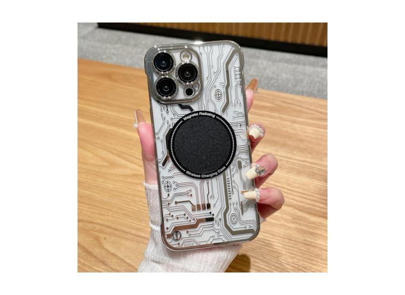 Capa magnética ultrafina com padrão de circuito sem moldura para iPhone 11 12 13 14 Pro Max 14Plus Capa transparente revestida de luxo, prateada, para iPhone 13 ProMax