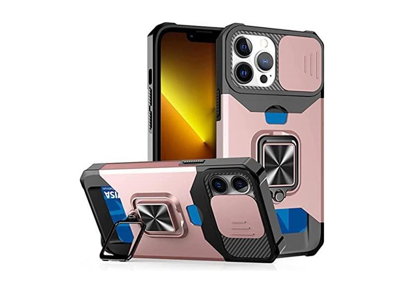 Capa para iPhone 14 13 12 11 Pro Max XS XR 8 7 Plus Slide Titular do cartão da câmera Slot Duty Carteira Protetora com capa de suporte de anel, ouro rosa, para iPhone SE 2020