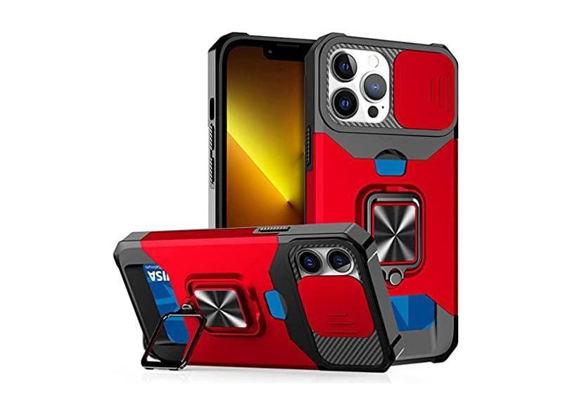 Capa para iPhone 14 13 12 11 Pro Max XS XR 8 7 Plus Slide titular do cartão da câmera Slot Duty Carteira Protetora com capa de suporte de anel, vermelho, para iPhone 7 Plus