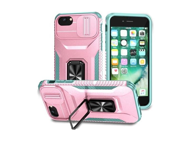 Capa para iPhone 6/7 / 8 / SE Capinha - Combina uma tampa deslizante anti-riscos para a lente da câmera e um suporte magnético giratório de 360 graus - Rosa e Verde